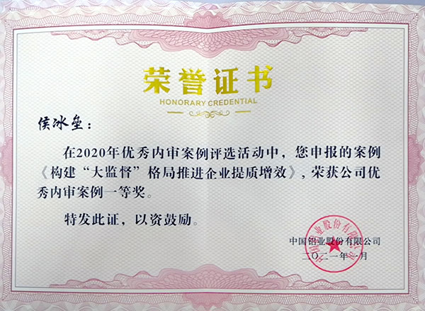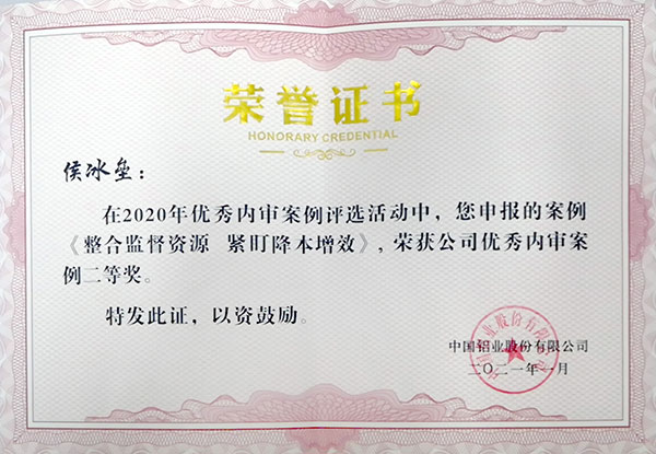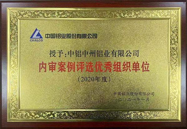 2021年1月协助中铝中州铝业赢得中铝2020年度内审案例评选优 秀组织单位”奖。